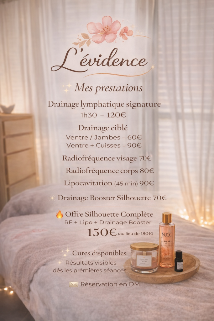 La mission de L’Évidence est d’accompagner chaque cliente avec douceur, écoute et professionnalisme grâce à des soins ciblés comme le drainage lymphatique, la lipocavitation et la radiofréquence.
